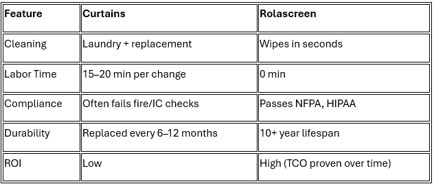 A: Unlike fabric, Rolascreen’s non-porous surface doesn’t harbor bacteria and can be wiped down instantly—reducing HAI risks significantly.